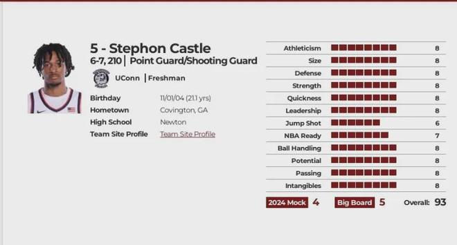 作为2024年选秀大会的第四顺位秀,卡斯尔无意间给榜眼秀迪伦-哈珀施加了一些压力,圣安东尼奥马刺队连续两年获得NBA最佳新秀荣誉,卡斯尔是马刺队史第四位获此殊荣的球员,前三位分别是文班亚马、蒂姆-邓肯、大卫-罗宾逊,卡斯尔在新秀赛季首发47场比赛,总得分(1190分)、投篮命中数(423个)、抢断数(74次)方面均领跑同届新秀,上赛季扣篮大赛亚军,还是圣安东尼奥马刺队最难缠的外线防守者。