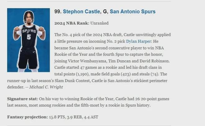 在赛季初ESPN评选的NBA2025-26百大球星中,卡斯尔排名第99,网站评语如下: